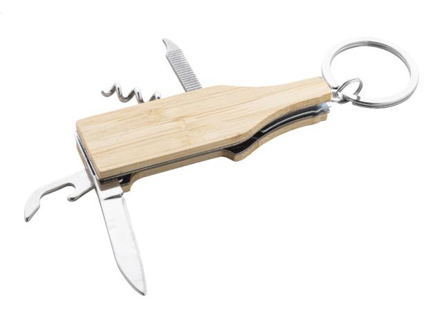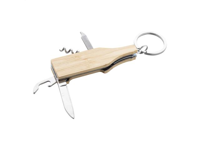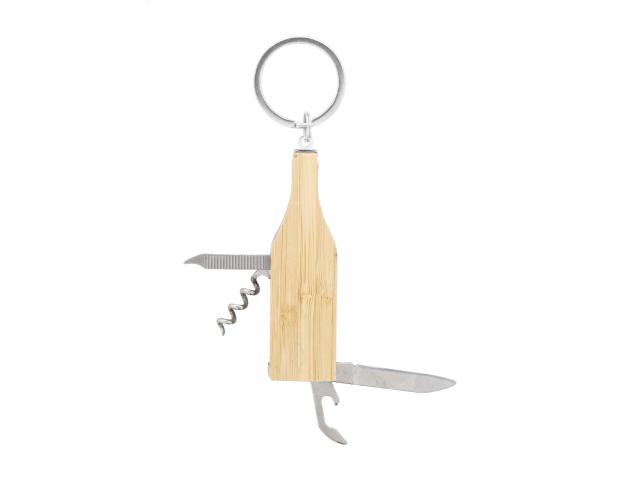 Bottle shaped multi tool keyring in stainless steel and bamboo. With 4 functions: knife, corkscrew, bottle opener and file.