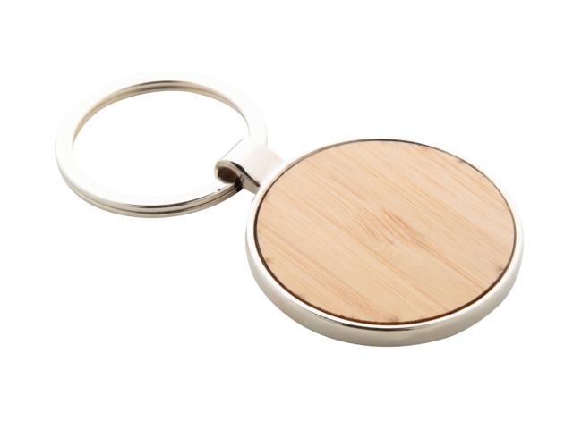 Round shaped metal keyring with bamboo insert. In kraft paper box.