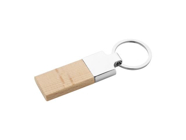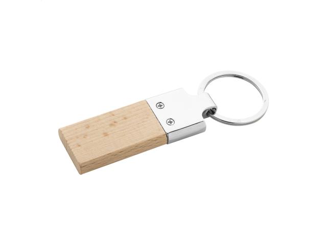 Rectangular shaped metal and beech wood keyring with metal ring.