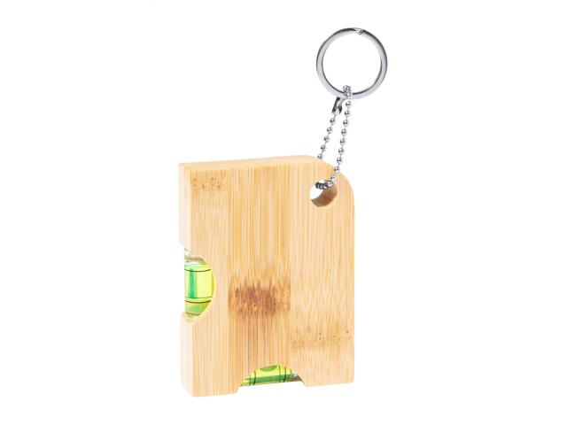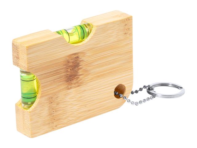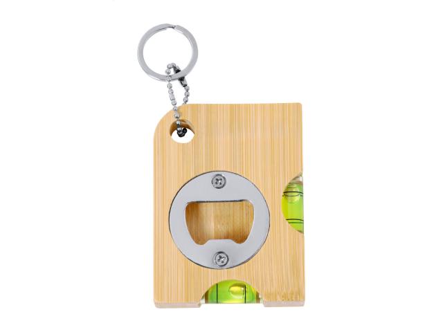 Multifunctional bamboo keyring with metal ring, bottle opener and dual spirit levels.