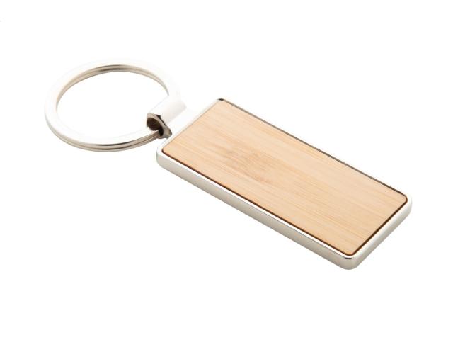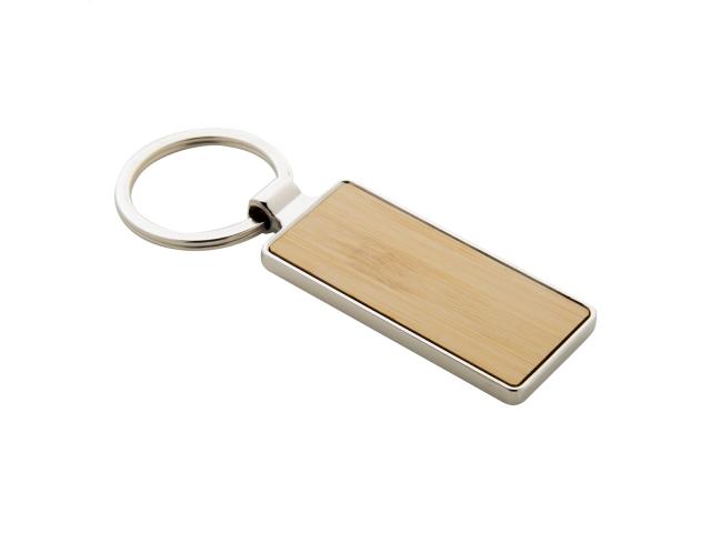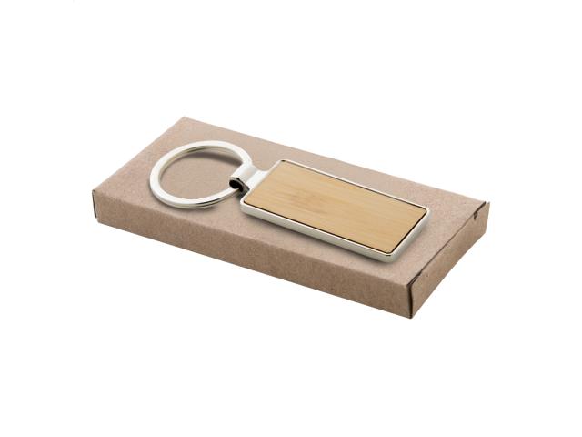 Rectangular shaped metal keyring with bamboo insert. In kraft paper box.