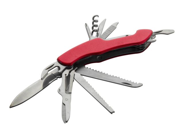 Stainless steel pocket knife with 12 functions and aluminium handle.