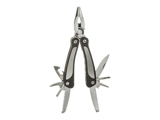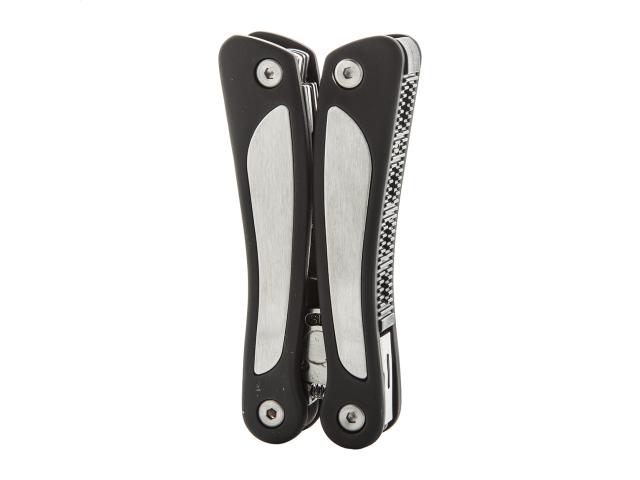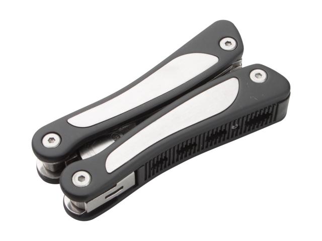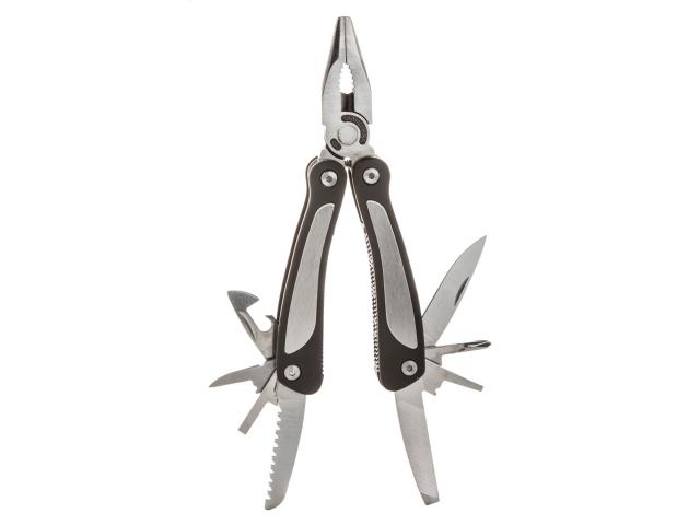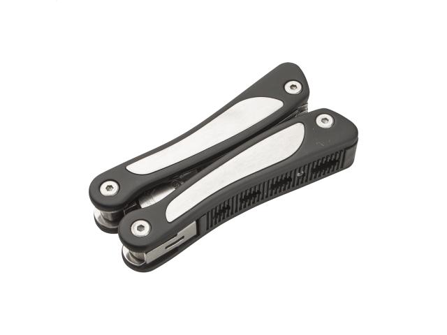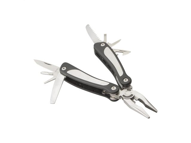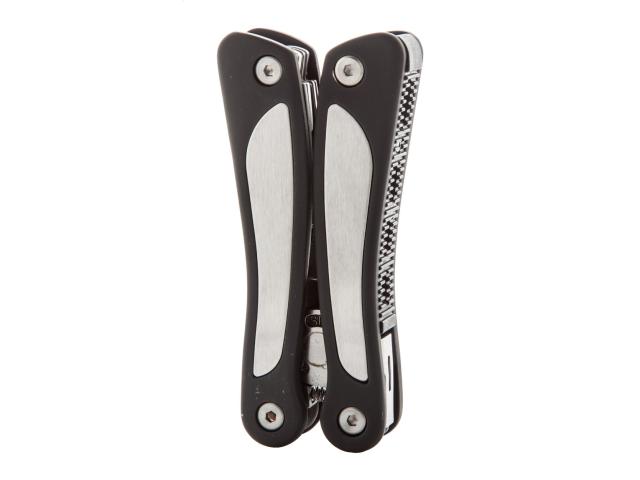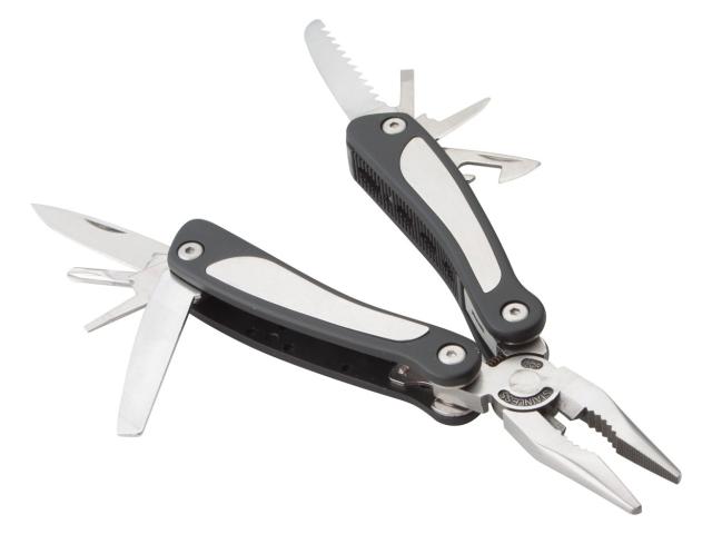 Stainless steel multi tool with 9 functions: tool, nail file, 3 screwdrivers, 2 knives, can opener and saw. With polyester pouch.