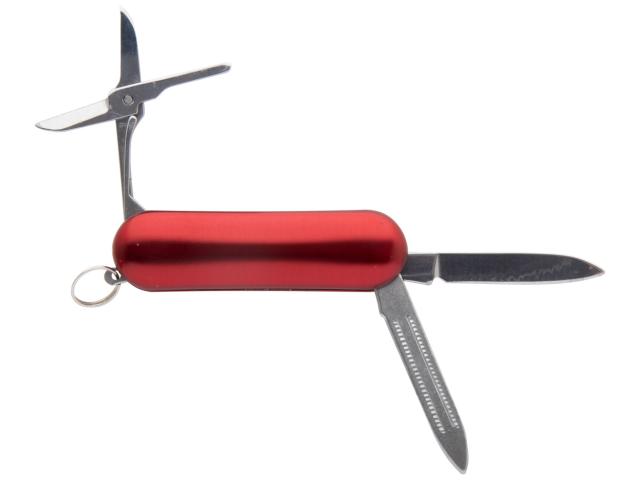 Mini, stainless steel pocket knife with 3 functions and aluminium handle.