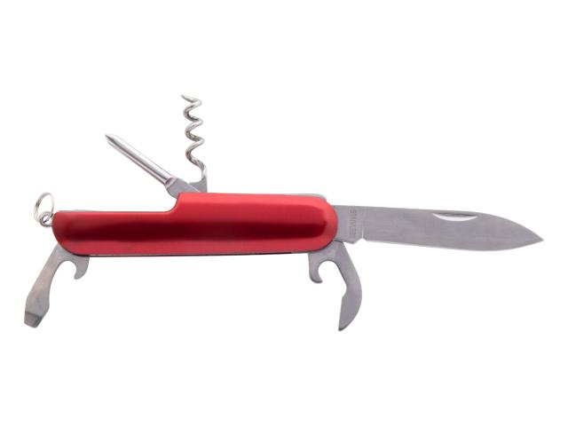 Stainless steel pocket knife with 5 functions and aluminium handle.