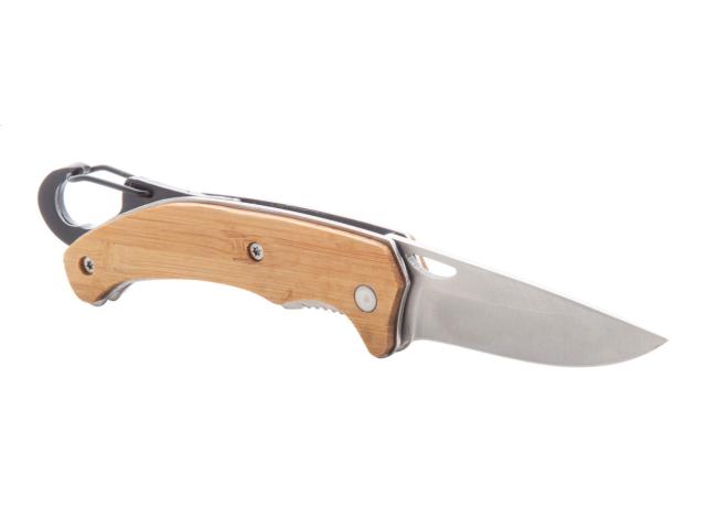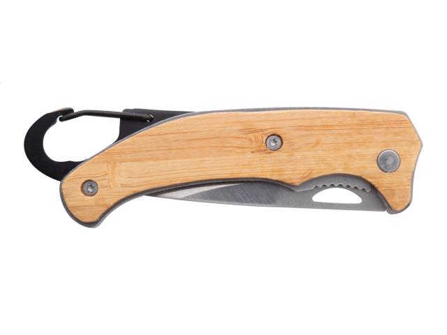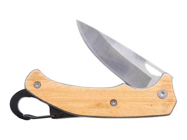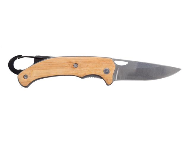 Stainless steel pocket knife with bamboo handle and carabiner. With safety lock.