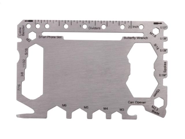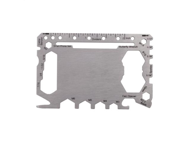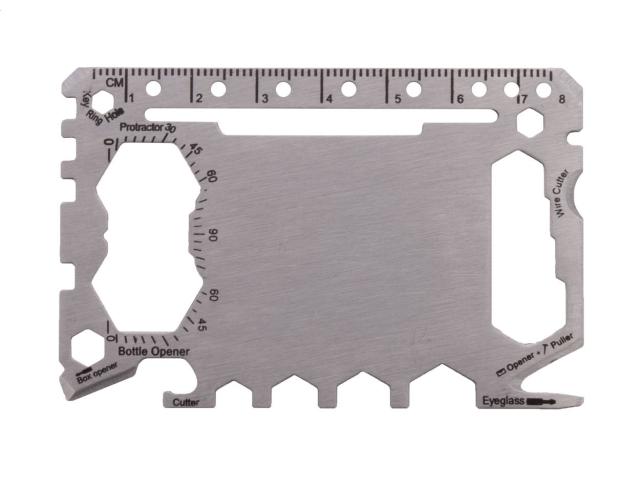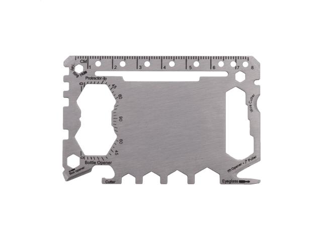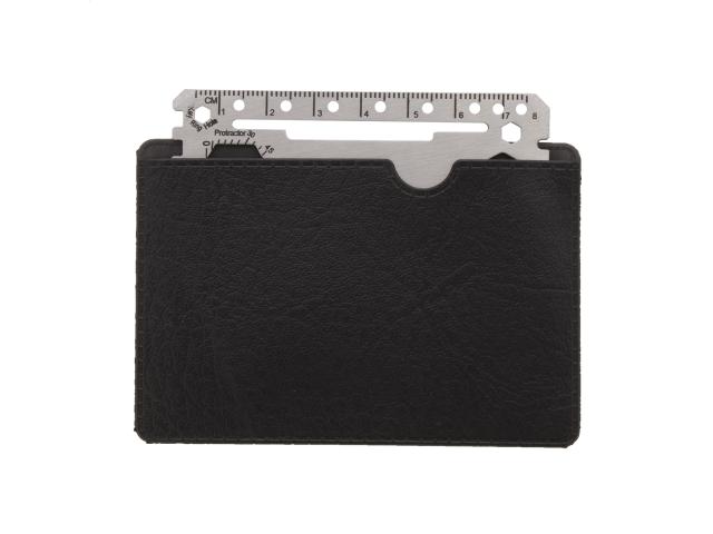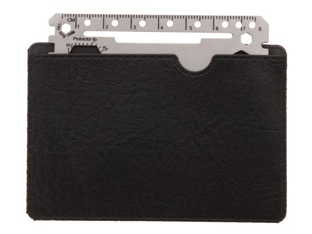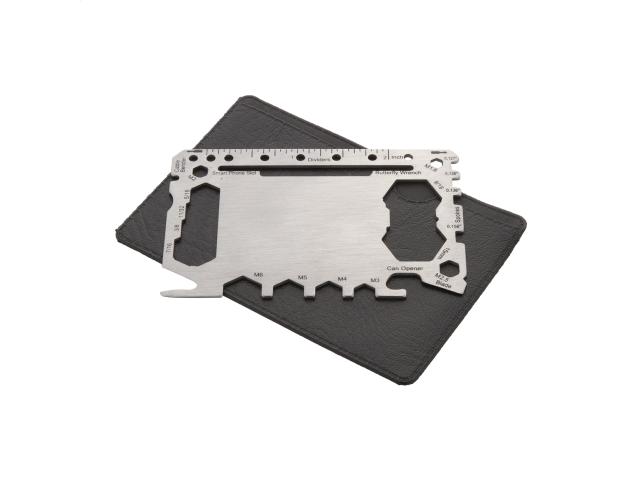 Stainless steel, credit card shaped multi tool with 20 functions, in PU leather pouch.