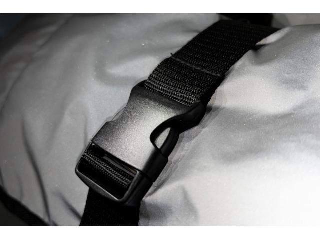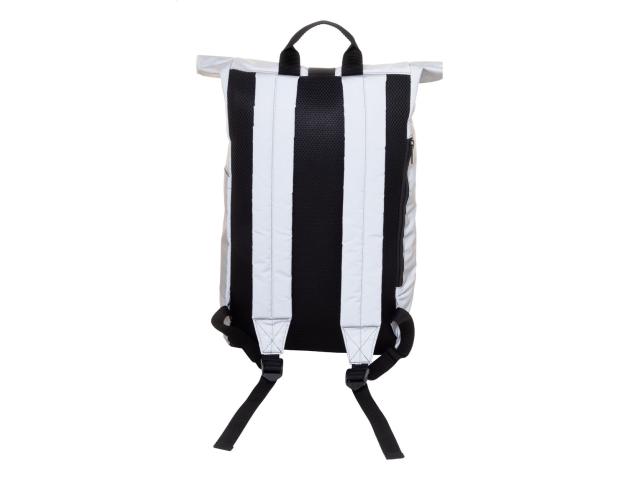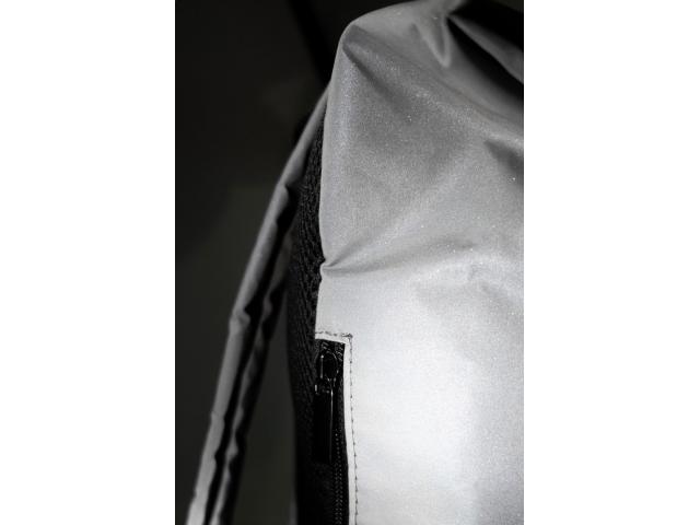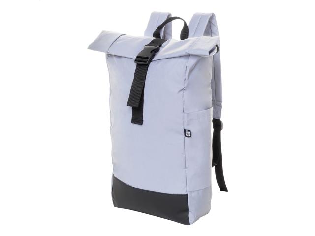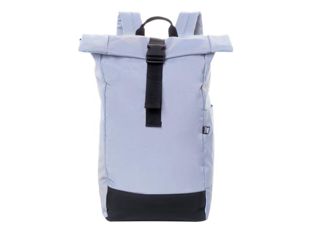 Reflective rolltop backpack in RPET polyester with buckle closure main compartment, hidden zipped pocket, padded laptop (15") compartment, side pocket, padded back and shoulder straps. With distinctive RPET label. For promotional use only, the product does not qualify as a Personal Protective Equipment.