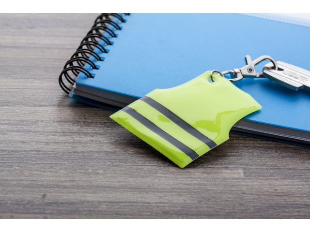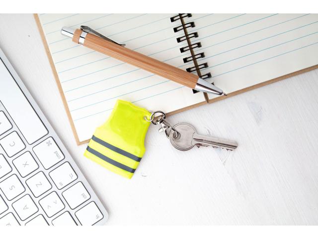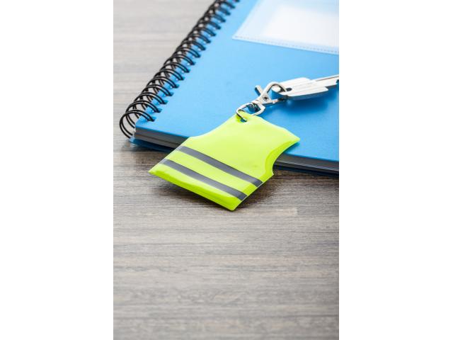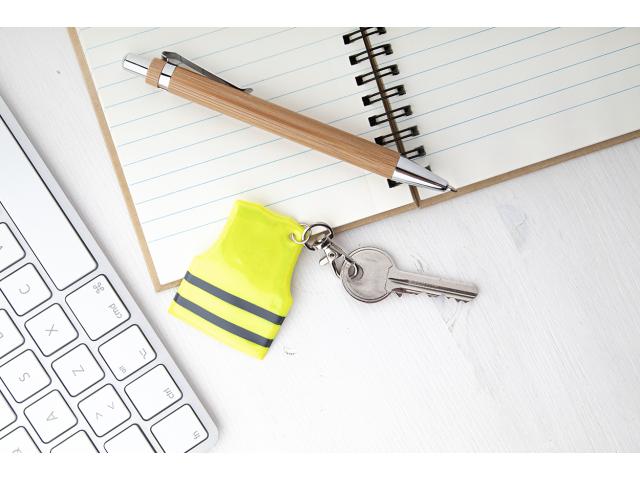 Mini reflective vest shaped keyring with carabiner. For promotional use only, the product does not qualify as a Personal Protective Equipment.