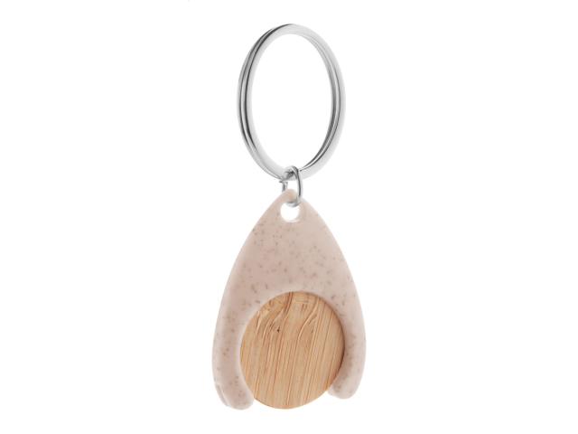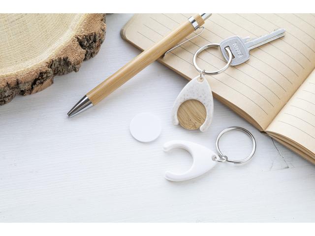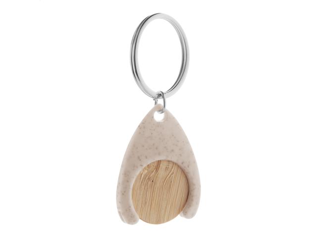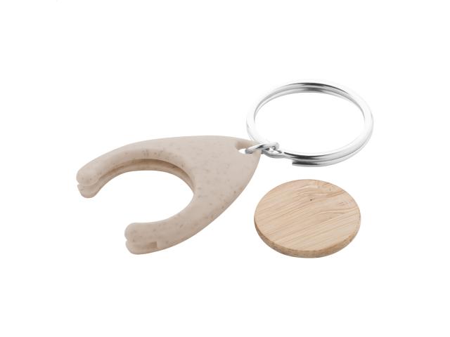 Bamboo shopping trolley coin in ecological wheat straw plastic keyring. Coin size: ø25×2 mm.
