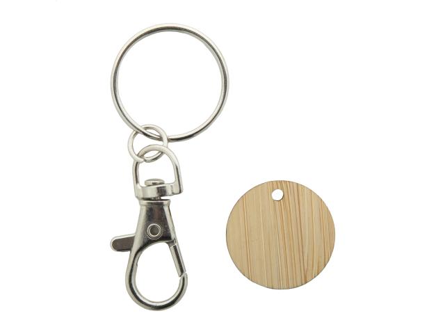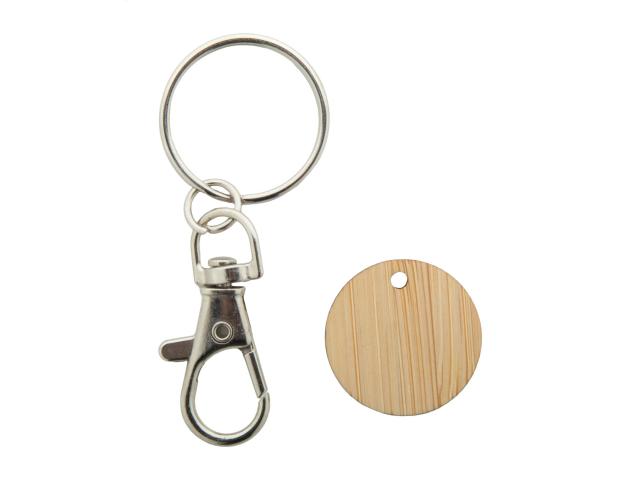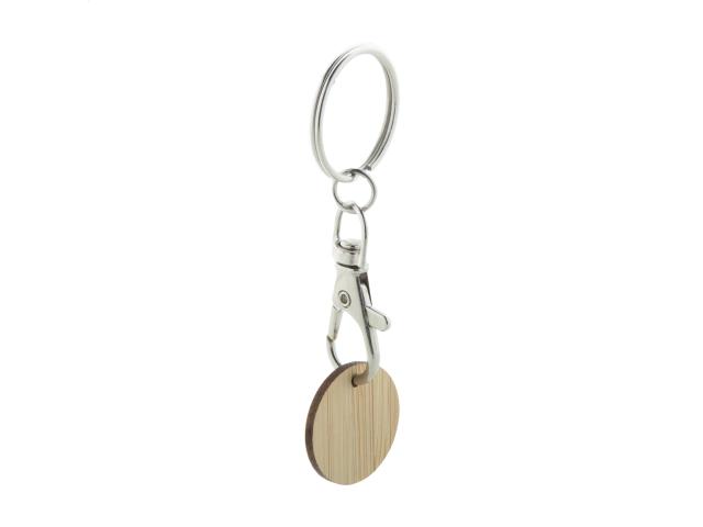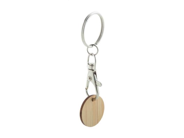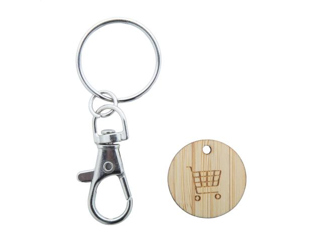 Metal carabiner keyring with bamboo shopping trolley coin. Coin size: ø23×2 mm.
