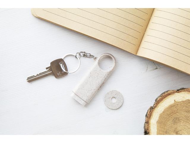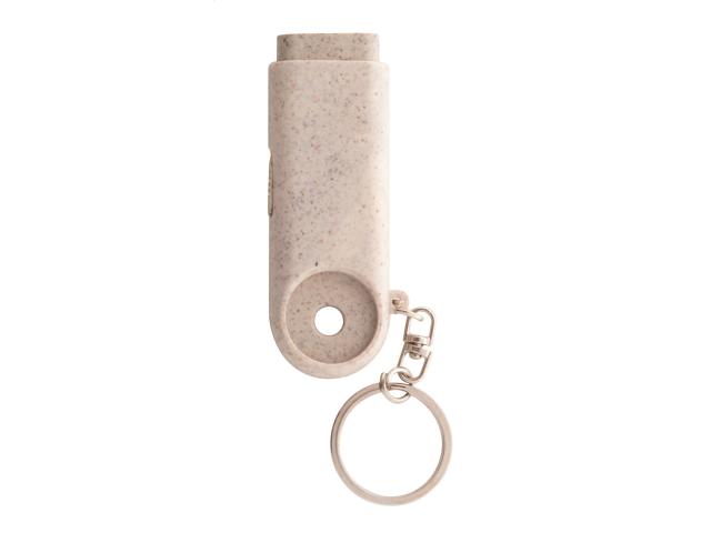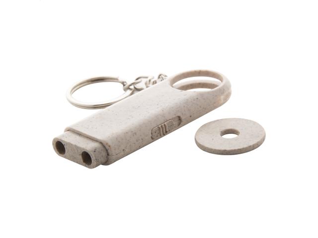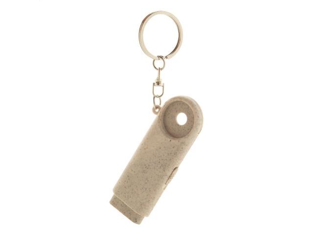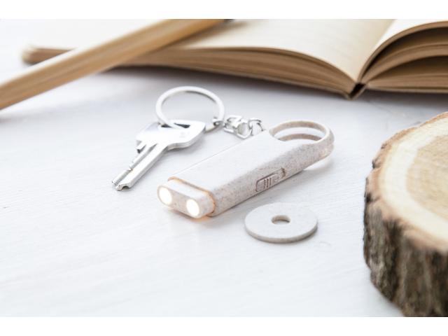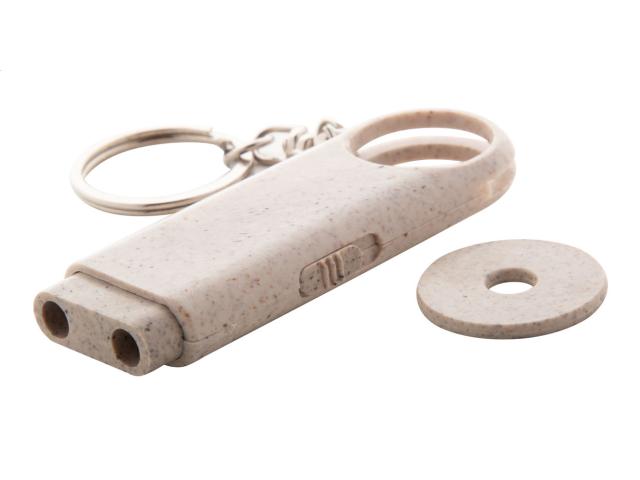Ecological wheat straw plastic keyring with shopping trolley coin and 2 LED flashlight. With button cell batteries.
