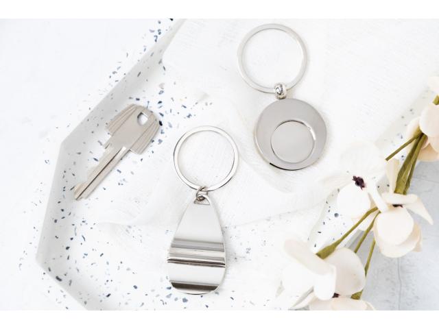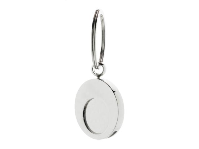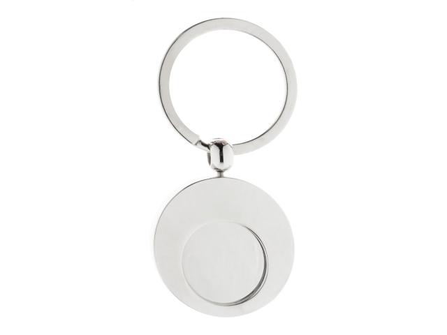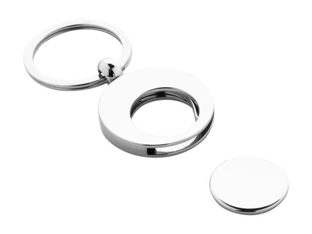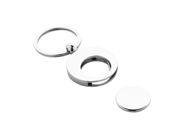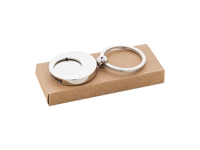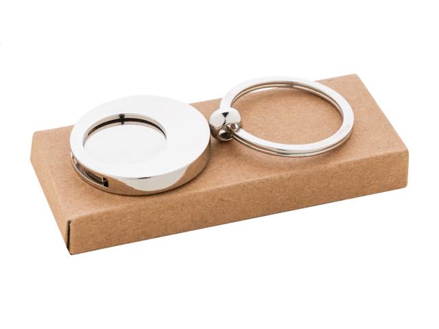 Round shaped metal keyring with shopping trolley coin. In kraft paper box.