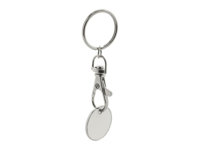 Metal keyring with shopping trolley coin. One side of the coin is painted, the other side has an engraved shopping trolley. Coin size: ø23×1,7 mm.