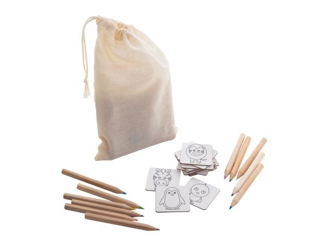 Colouring memory game in cotton carry pouch. Includes thematic paperboard memory game (24 tiles) and wooden coloured pencils (12 pcs) in paper box.