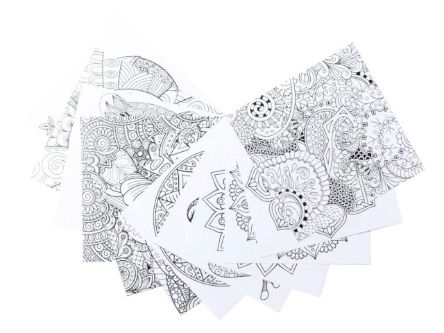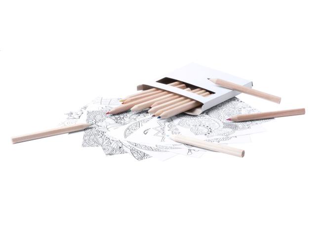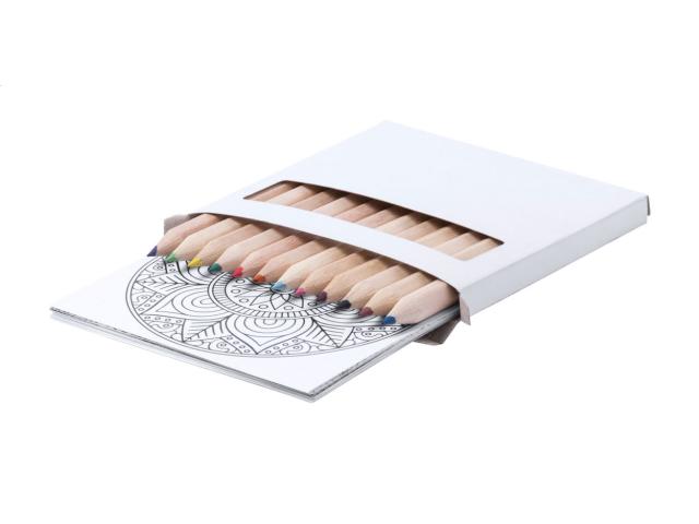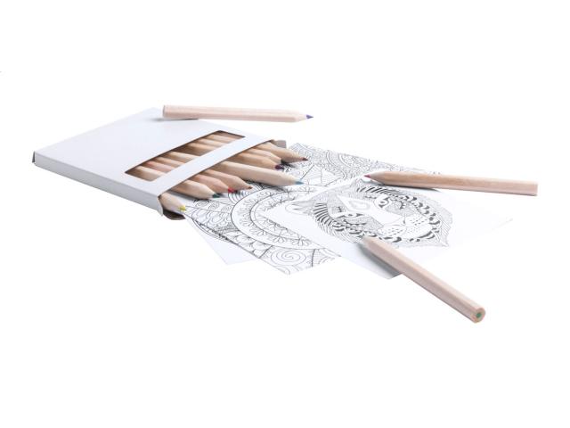 Mandala colouring set with 12 coloured pencils and 12 sheets of mandala design.