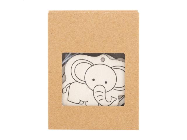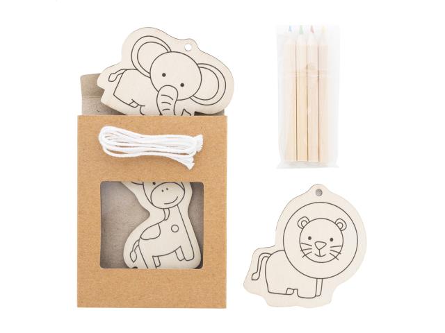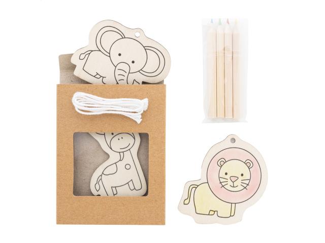 3 pc wooden animal figure colouring set, including 4 wooden coloured pencils and hanging cords. In kraft paper box.