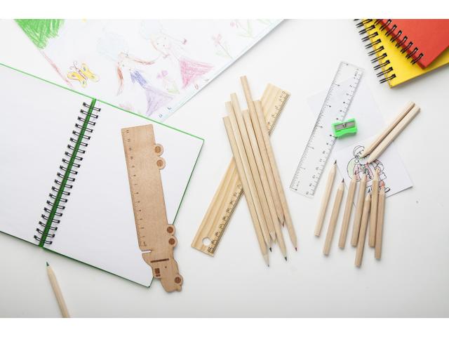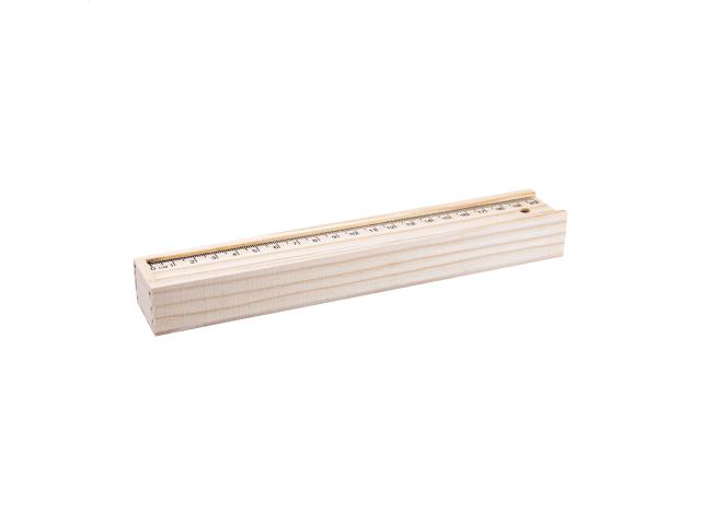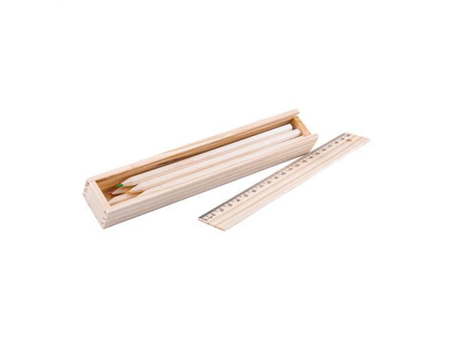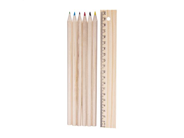 6 colour pencils in wooden box with 20 cm ruler.