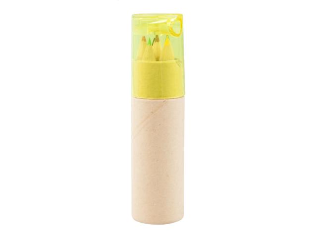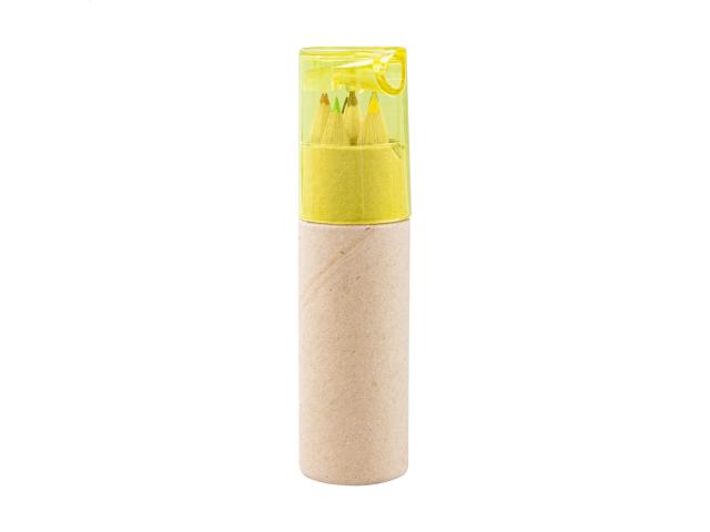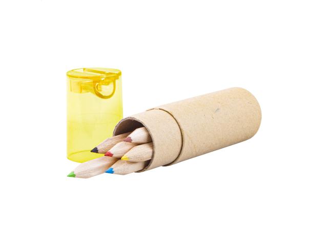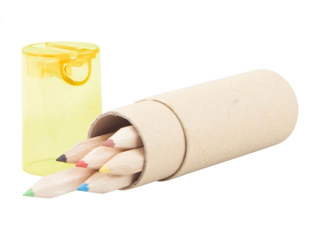 6 pc coloured pencil set in round cardboard case with plastic sharpener.