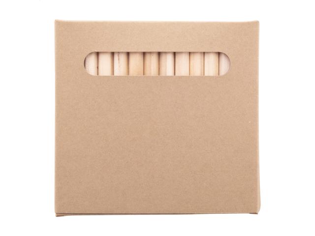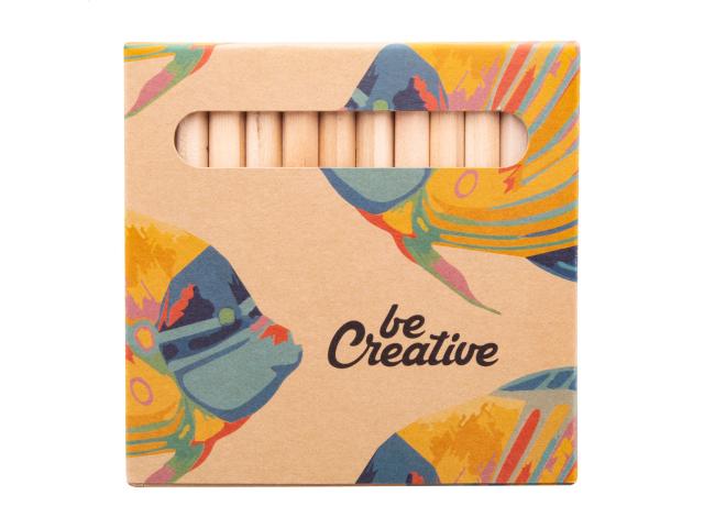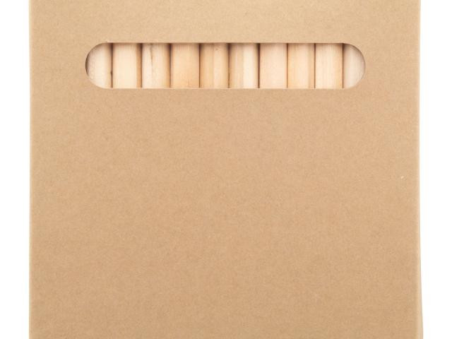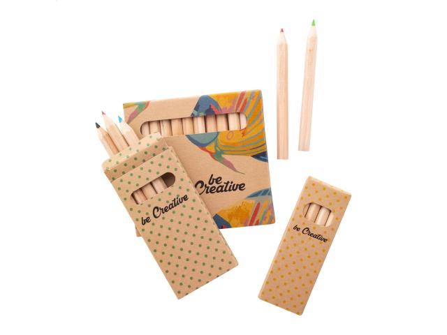 Wooden coloured pencils (12 pcs) in full colour printed kraft paper box. Price includes digital printing. MOQ: 100 pcs.