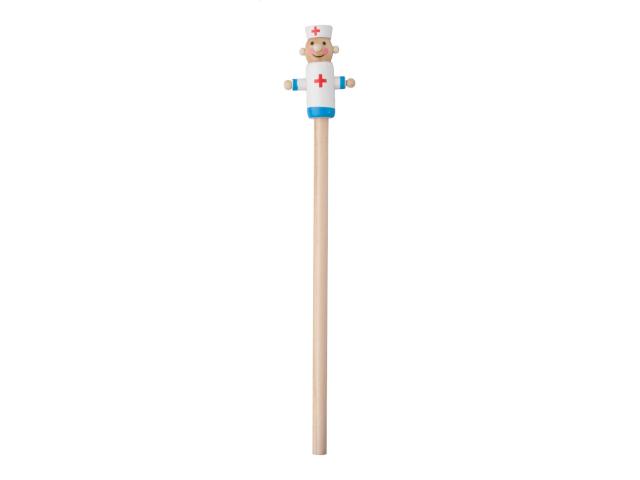 Wooden lead pencil with doctor figure on top, unsharpened.