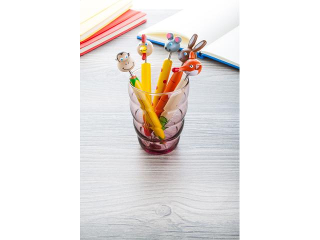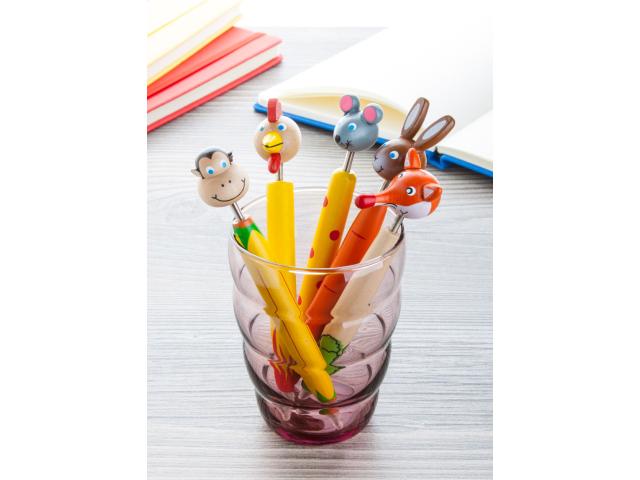 Wooden ballpoint pen with coloured barrel and animal figure. With blue refill.