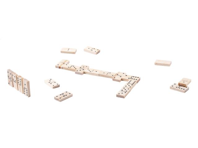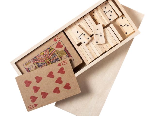 Game set in wooden box with dominoes and a deck of classic playing cards.