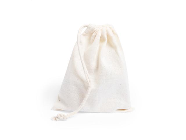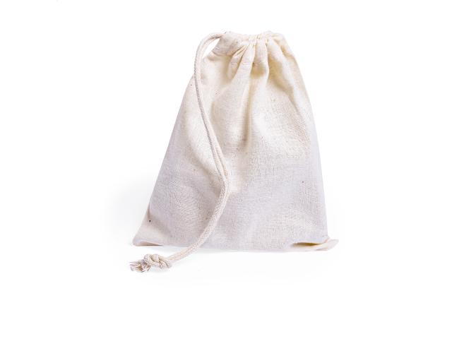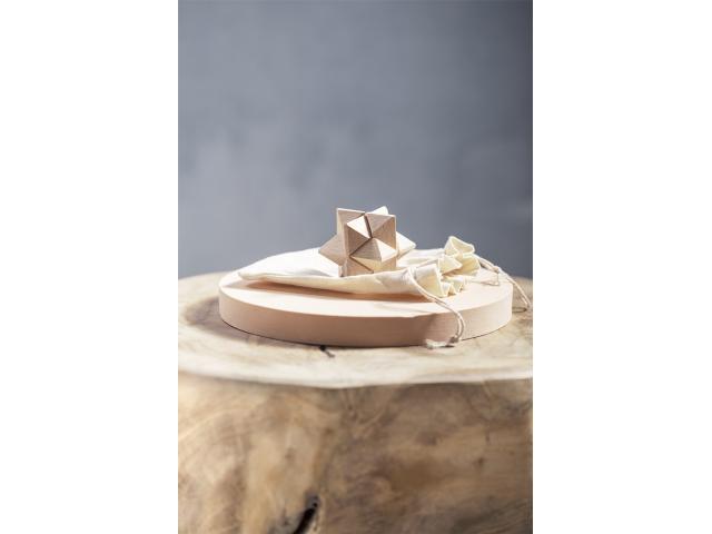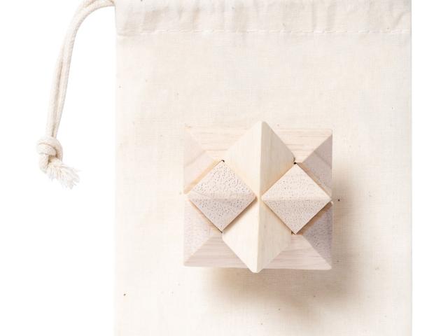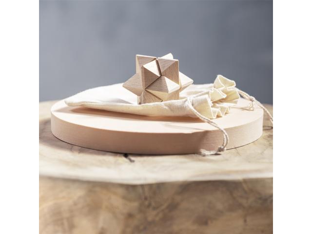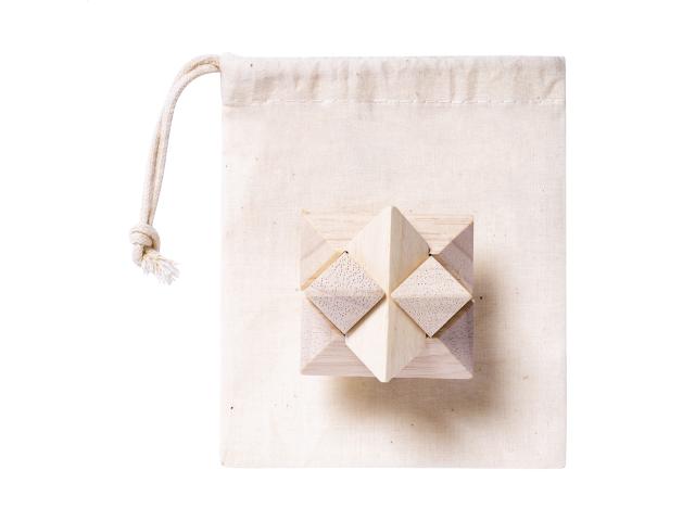 Wooden magic puzzle in cotton pouch with drawstring closure.