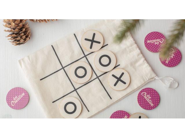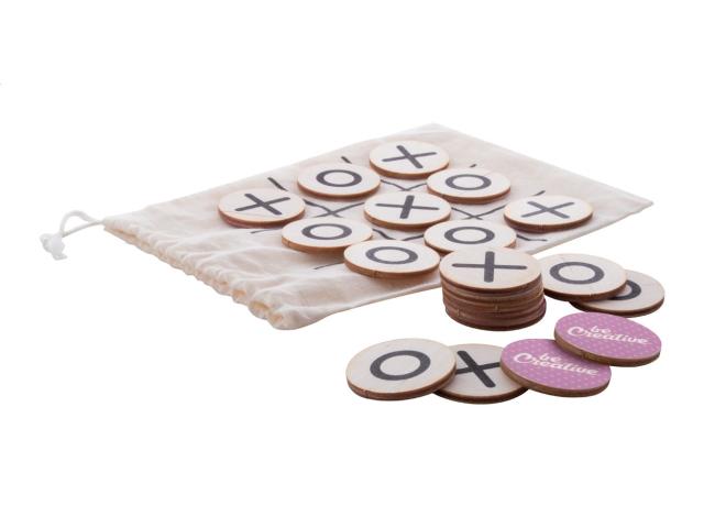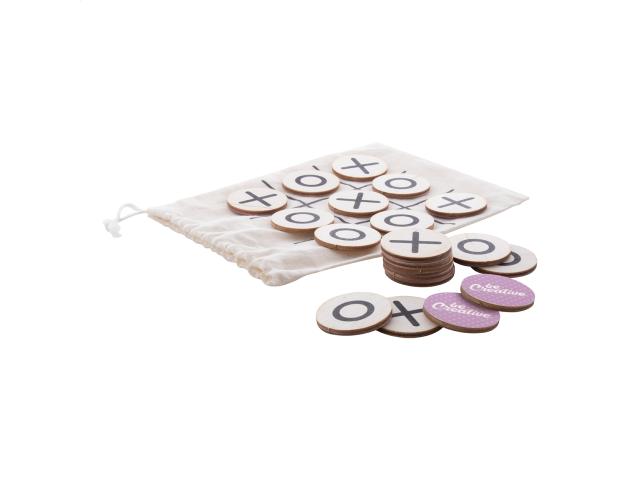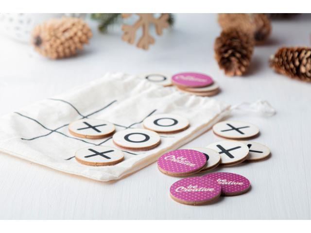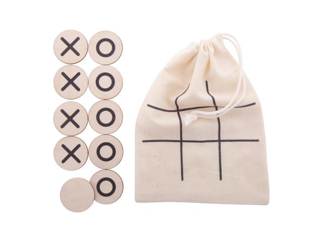 Custom made tic-tac-toe game in birch plywood with 10 tokens and cotton carry pouch. Price includes an identical full colour print on the backside of all tokens. MOQ: 100 pcs.