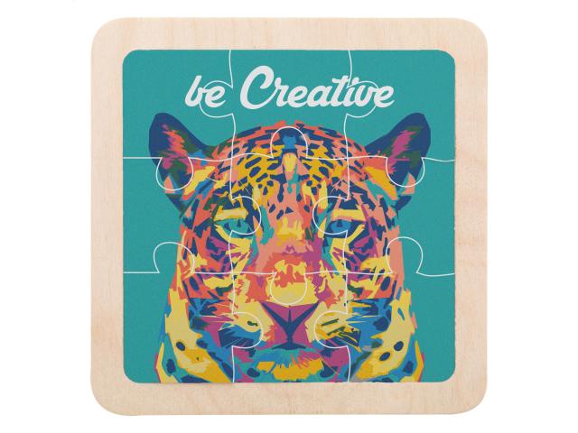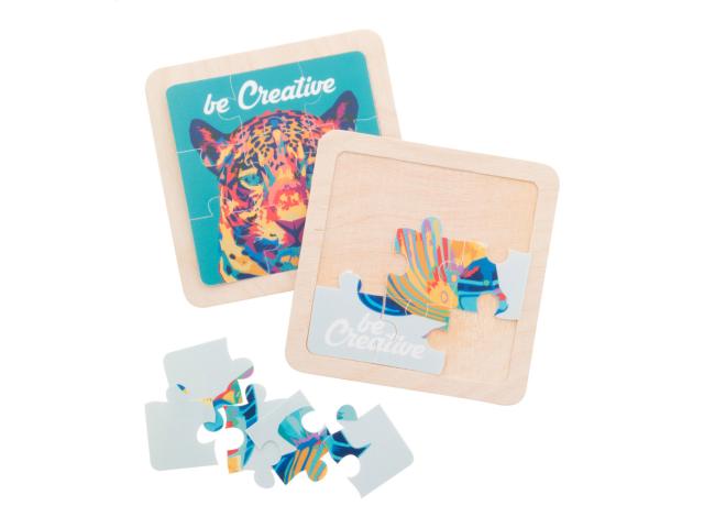 9 pc plastic puzzle with custom graphics in laminated birch wood holder. Price includes UV LED printing. MOQ: 100 pcs.