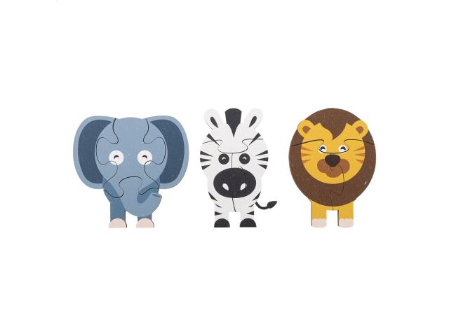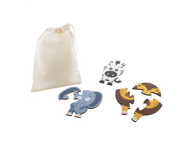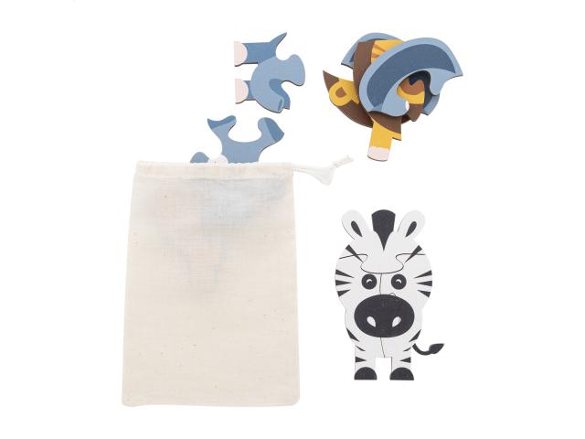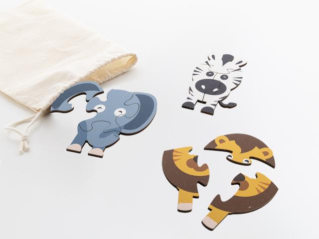 Kids puzzle set in birch plywood with 3 thematic figures. In cotton carry pouch.