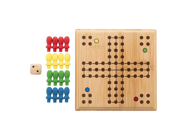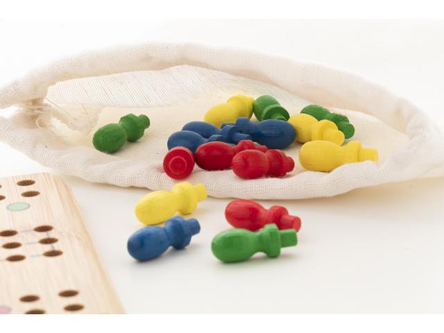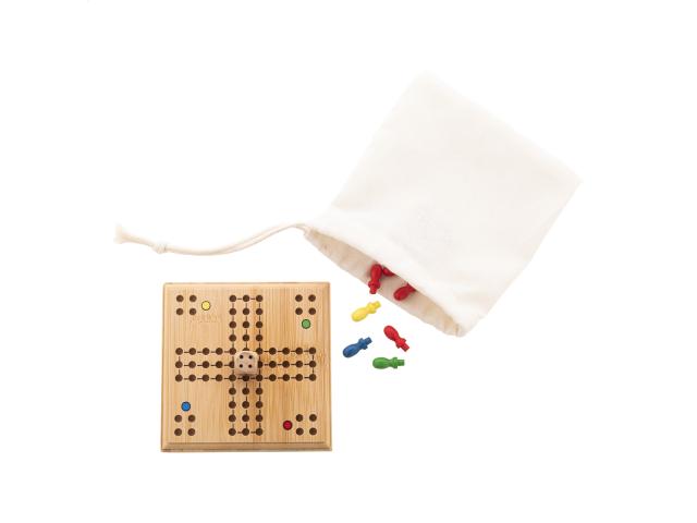 Bamboo ludo game in drawstring cotton pouch.