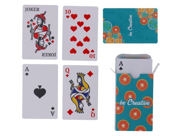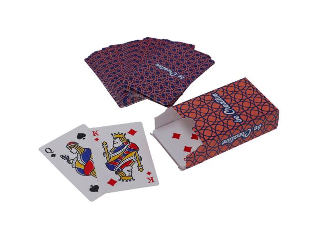 Custom made, classic playing cards in paper box. One standard deck with 54 cards. Price includes full colour printed box and an identical full colour print on the back side of each card. MOQ: 100 pcs.