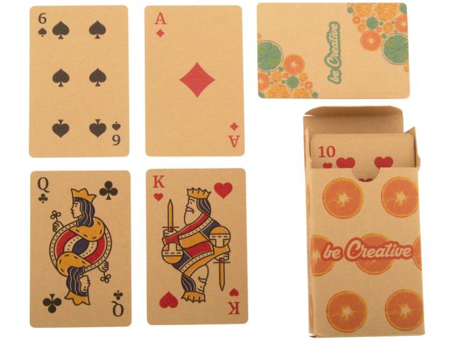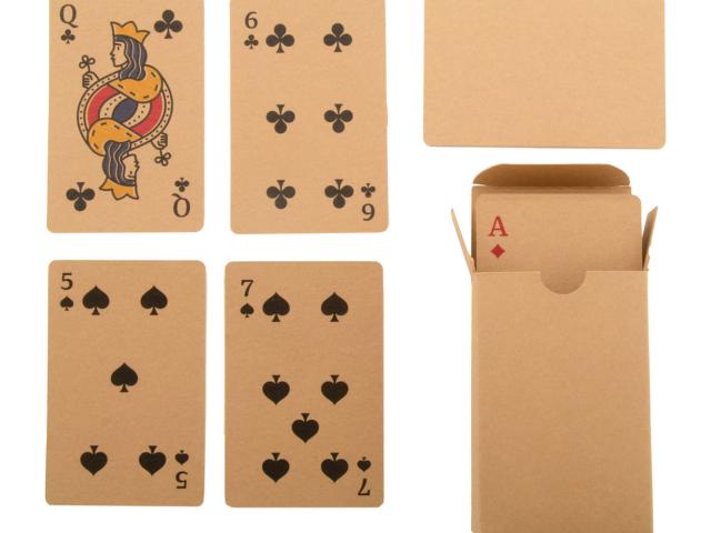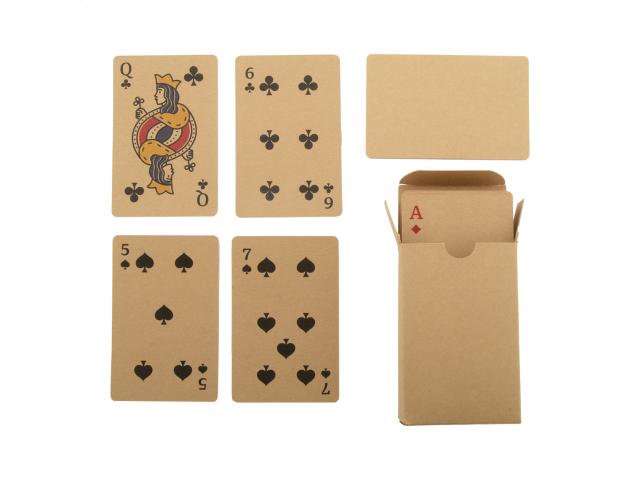 Custom made, kraft paper classic playing cards in kraft paper box. One standard deck with 54 cards. Price includes full colour printed box and an identical full colour print on the back side of each card. MOQ: 100 pcs.
