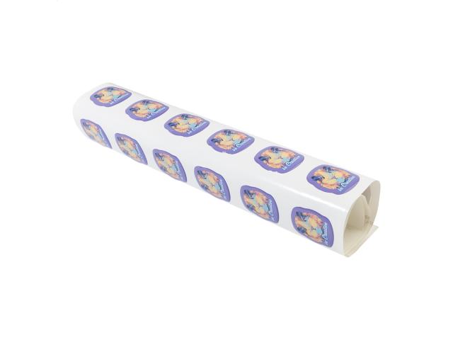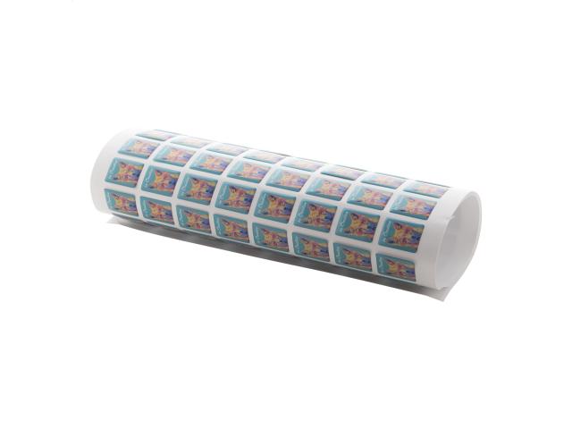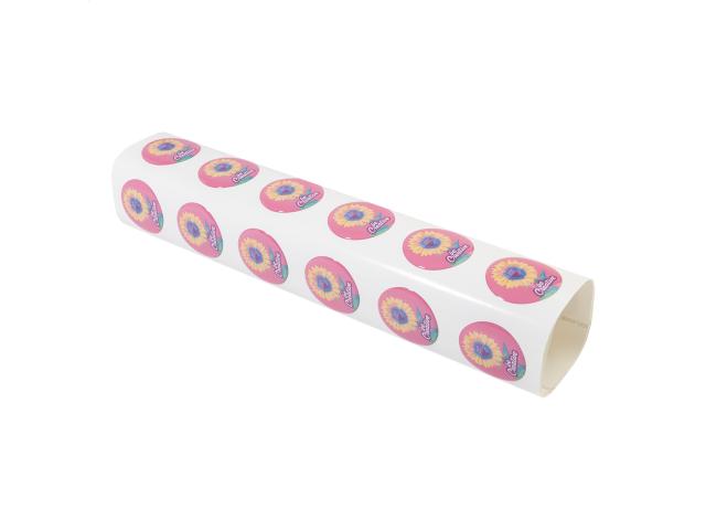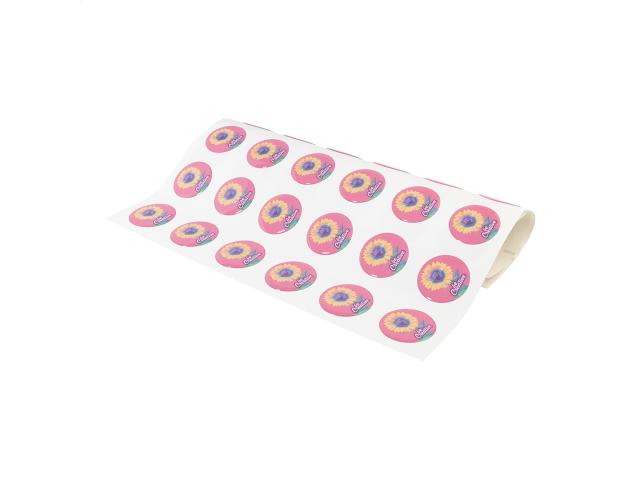 Epoxy domed sticker, produced in custom shape and size. Delivered in sheets. MOQ: 250 pcs.