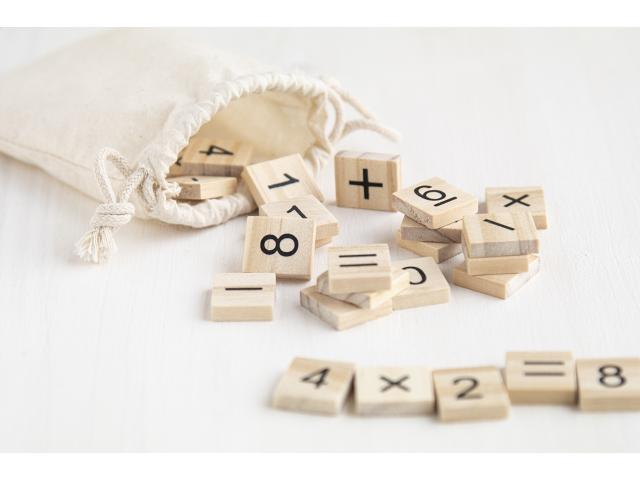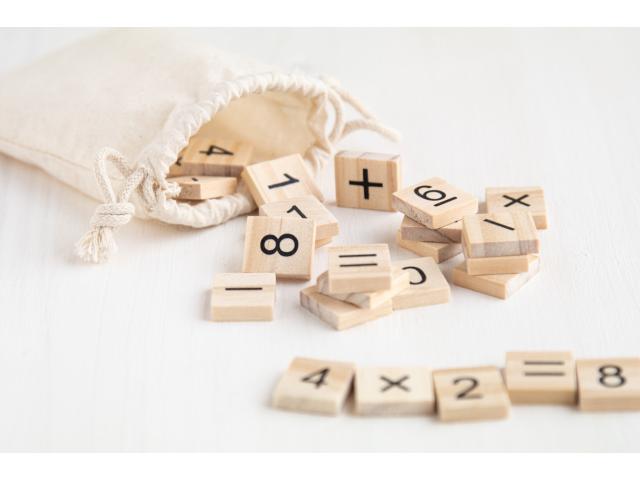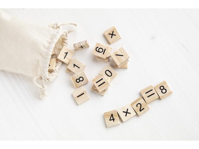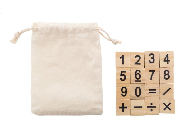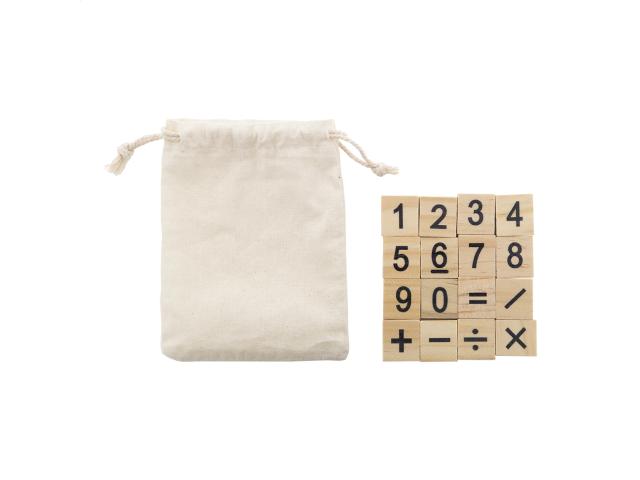 Wooden educational counting game in cotton drawstring pouch. With 32 tiles, including numbers and mathematical operation signs.