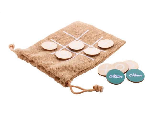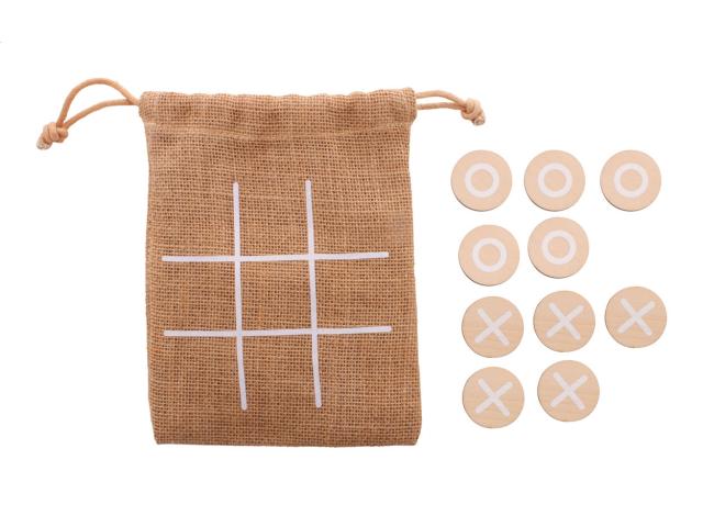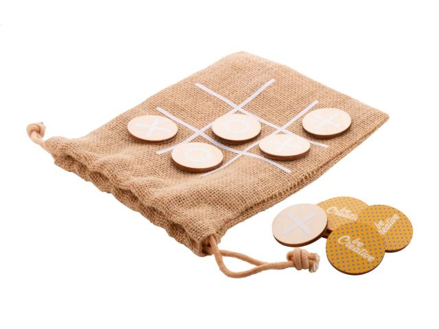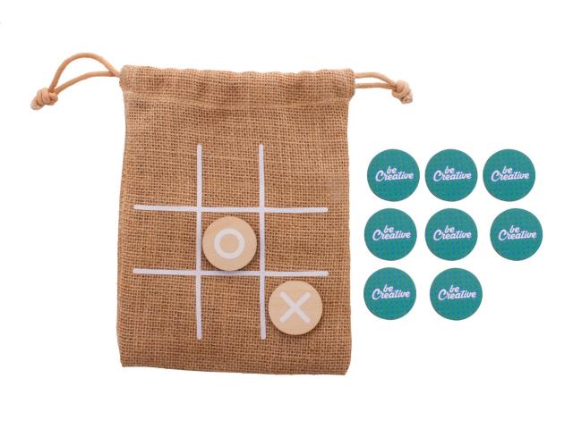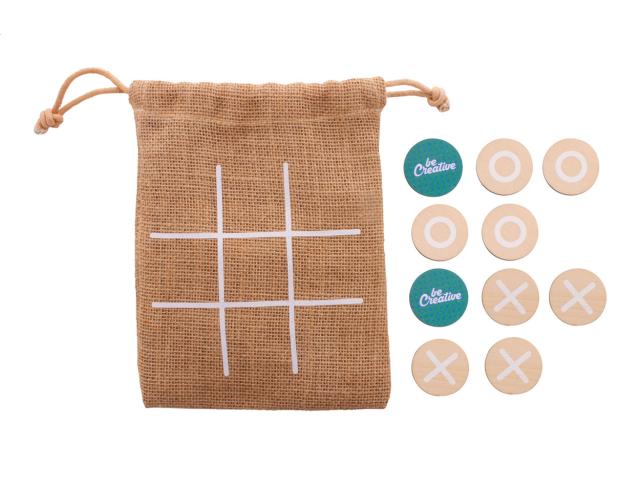 Custom made tic-tac-toe game in birch plywood with 10 tokens and jute carry pouch. Price includes an identical full colour print on the backside of all tokens. MOQ: 100 pcs.