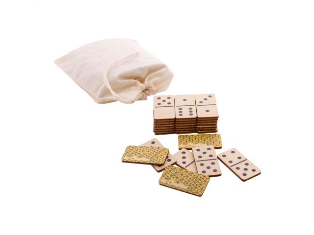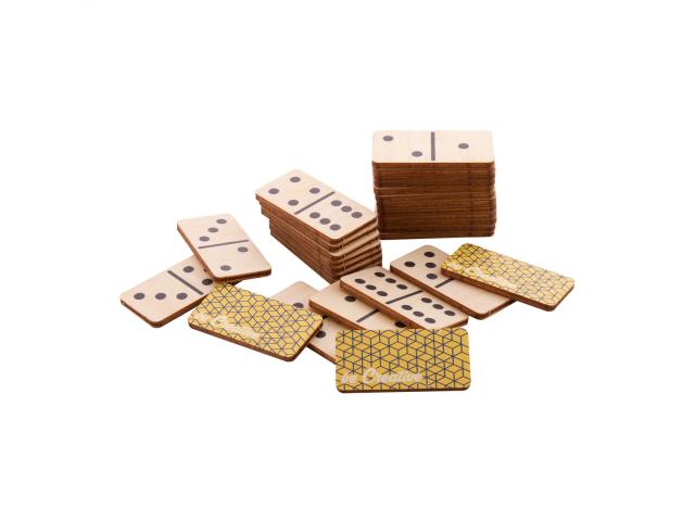 Custom made dominoes in birch plywood with 28 tiles and cotton carry pouch. Price includes an identical full colour print on the backside of all tiles. MOQ: 100 pcs.
