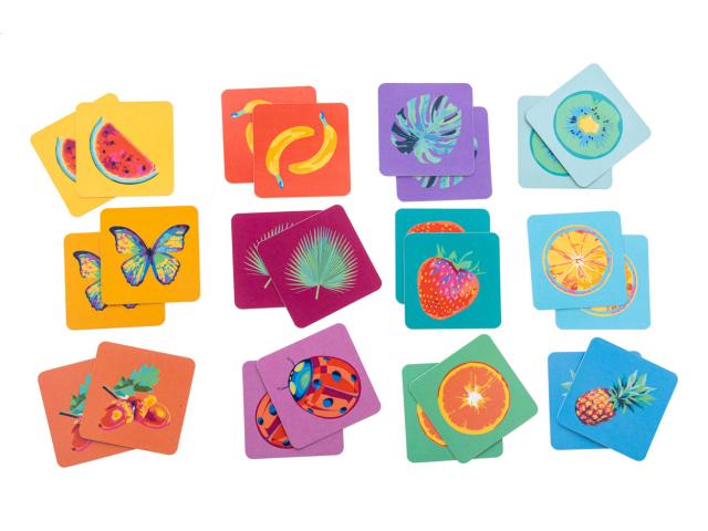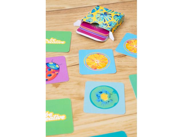 Custom made, paper memory game in custom paper box. With 24 tiles (55×55 mm). Price includes 12 different full colour print on front side of tiles, 1 full colour print on backside of all tiles and a full colour printed box. MOQ: 250 pcs.