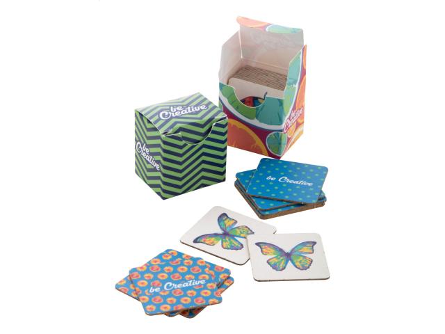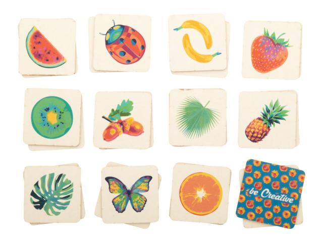 Paperboard memory game with thematic motives in custom paper box. With 24 tiles (40×40 mm). Price includes 12 different full colour print on front side of tiles, 1 full colour print on backside of all tiles and a full colour printed box. MOQ: 250 pcs.