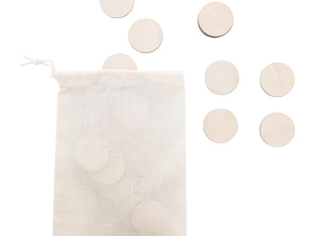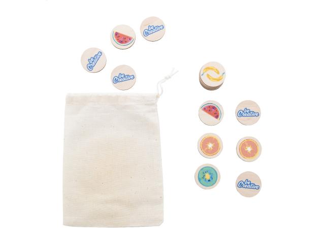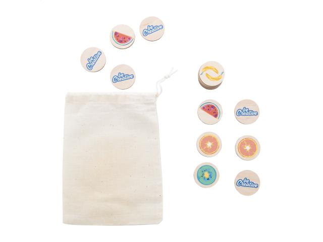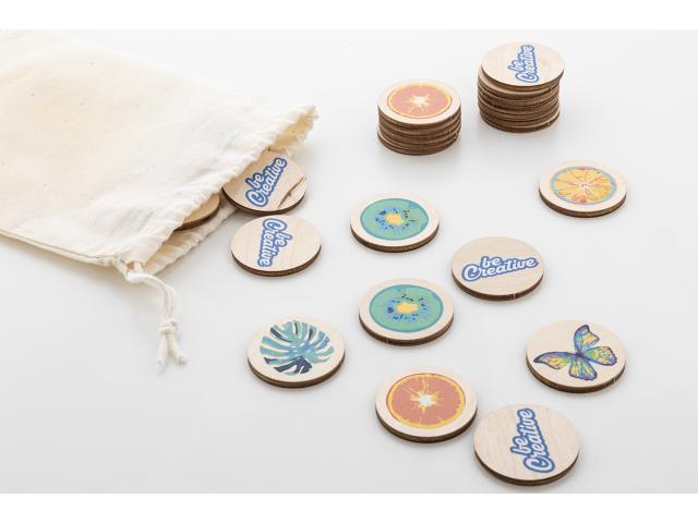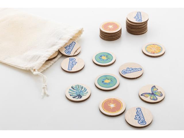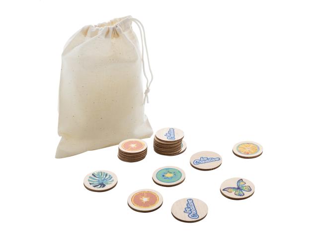 Custom made, laminated birch plywood memory game with custom graphics in cotton carry pouch. With 24 tiles (ø35 mm). Price includes 12 different full colour print on front side of tiles and an identical full colour print on backside of all tiles. MOQ: 50 pcs.