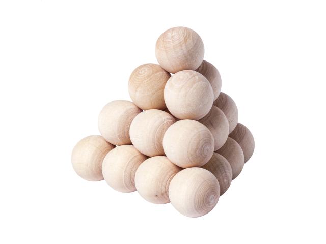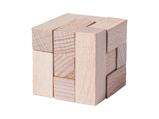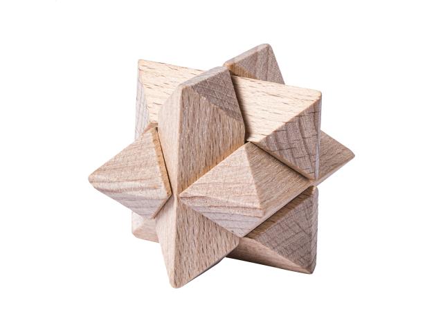 3 wooden magic puzzles in wooden box.