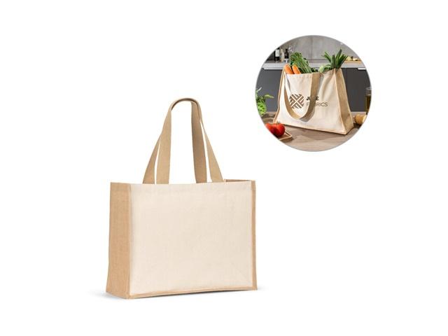 Platnena torba (320 g/m²) s laminiranim dnom i bočnim stranama od jute (350 g/m²) u prirodnim tonovima. Sadrži ručke dužine 60 cm. 420 x 330 x 190 mm