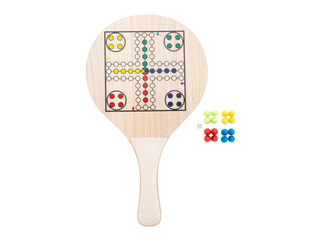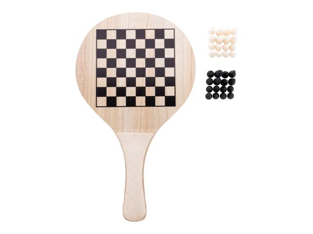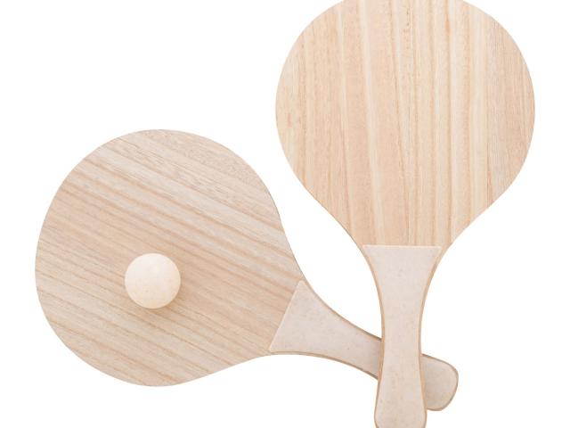 Wood and ecological wheat straw plastic beach tennis set with 2 rackets and one ball. Including 3 board games, which can be played on the rackets. In cotton drawstring pouch.