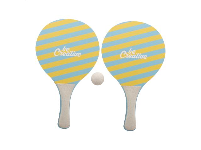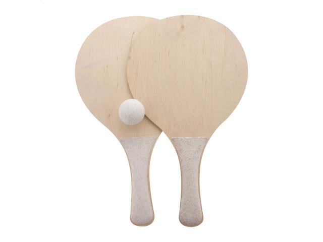 Custom made beach tennis with 2 rackets and one ball. Made of birch plywood and ecological wheat straw plastic. Price includes an identical full colour print on the front side of both rackets. MOQ: 50 pcs.