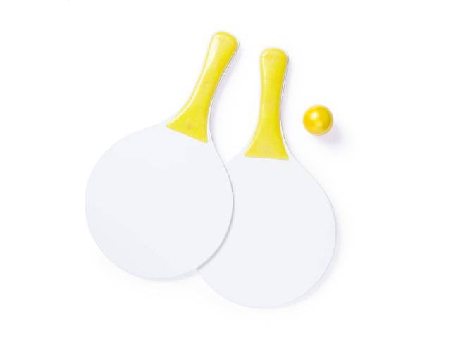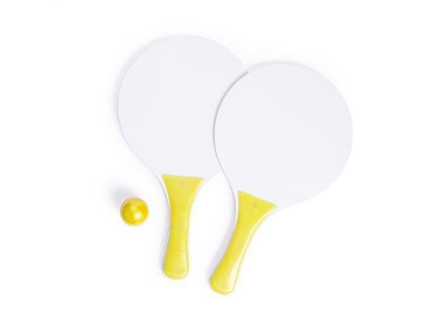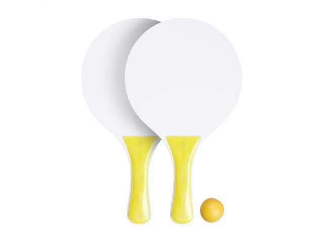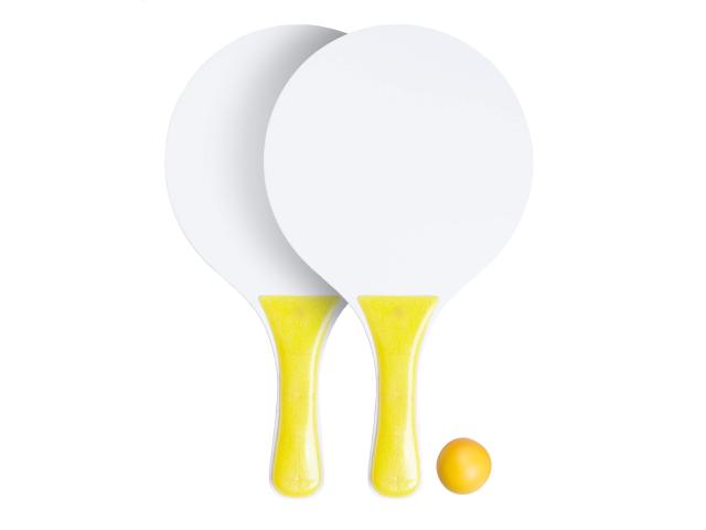 Beach tennis with 2 rackets and one ball, made of wood and plastic.