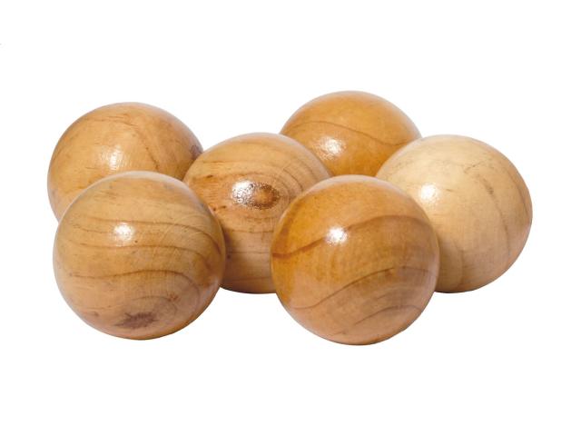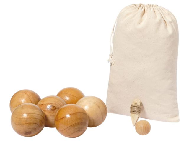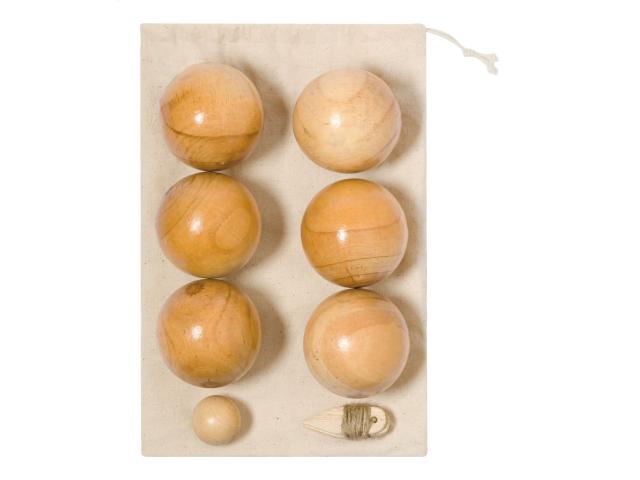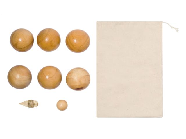 Wooden petanque game set with 6 balls. In cotton drawstring pouch.