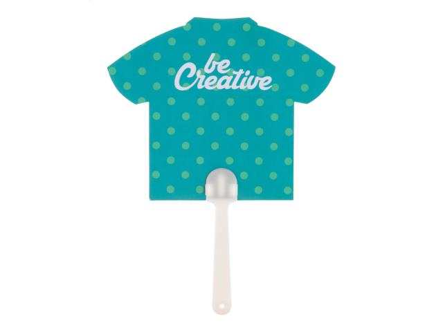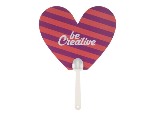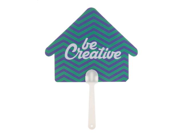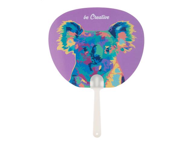 Custom made hand fan with plastic handle and laminated paper. Digital printed with your graphic on both sides. MOQ: 100 pcs.