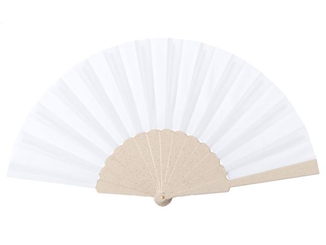 RPET polyester hand fan with bamboo fibre plastic ribs. In kraft paper box.
