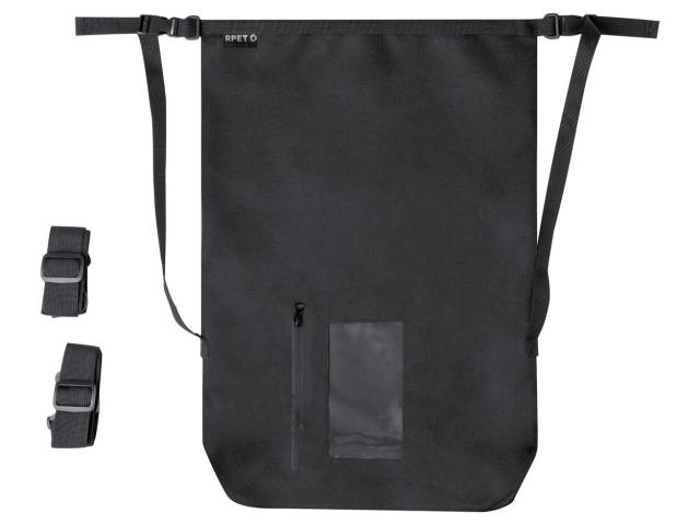 Waterproof, 300D RPET polyester dry bag backpack with zipped touch screen pocket and adjustable straps. Capacity: 25l.